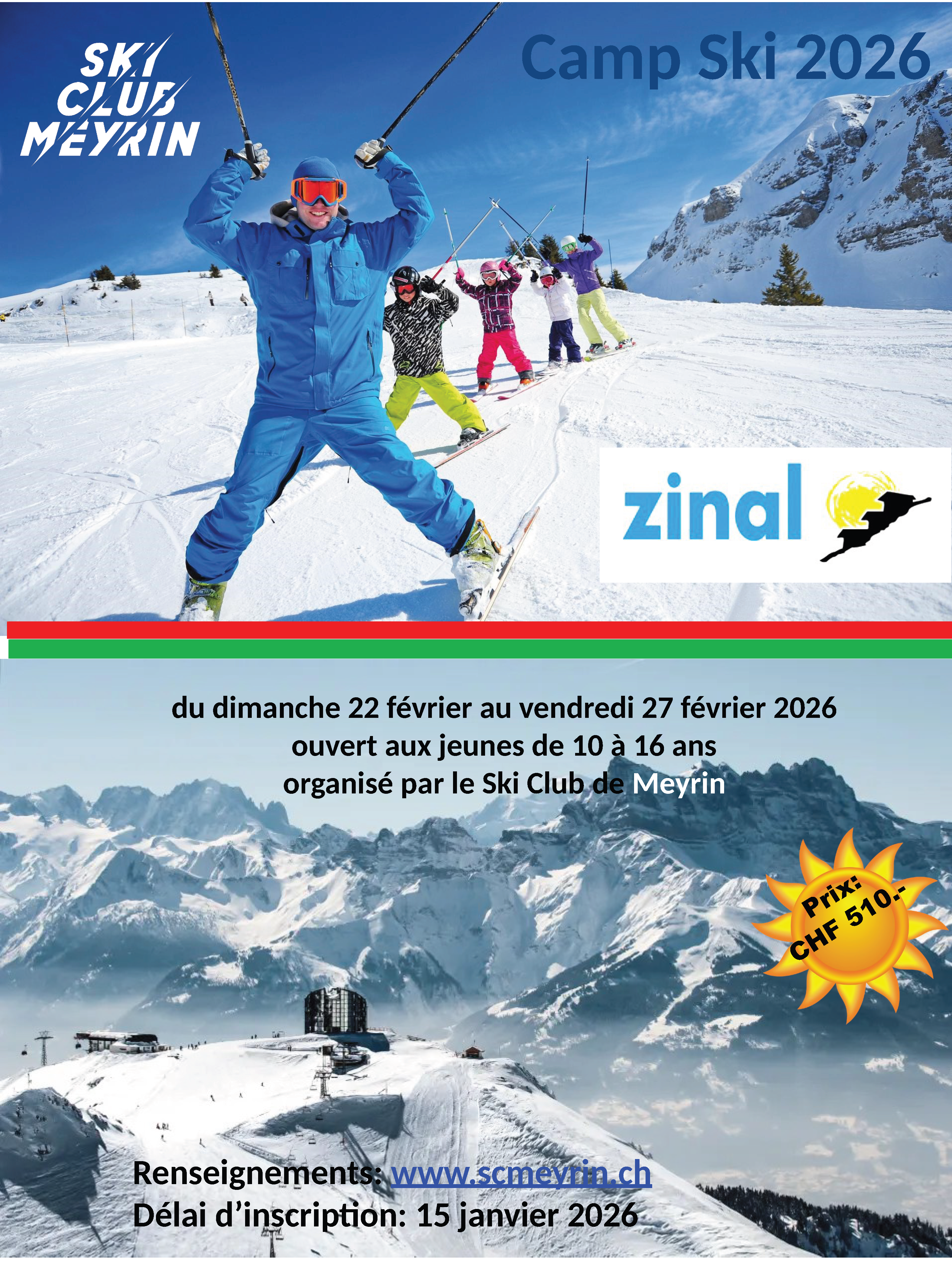 Le camp de ski ou de surf du Ski Club de Meyrin aura lieu du dimanche 22 février au vendredi 27 février 2026 dans la station de ski de Zinal (VS).