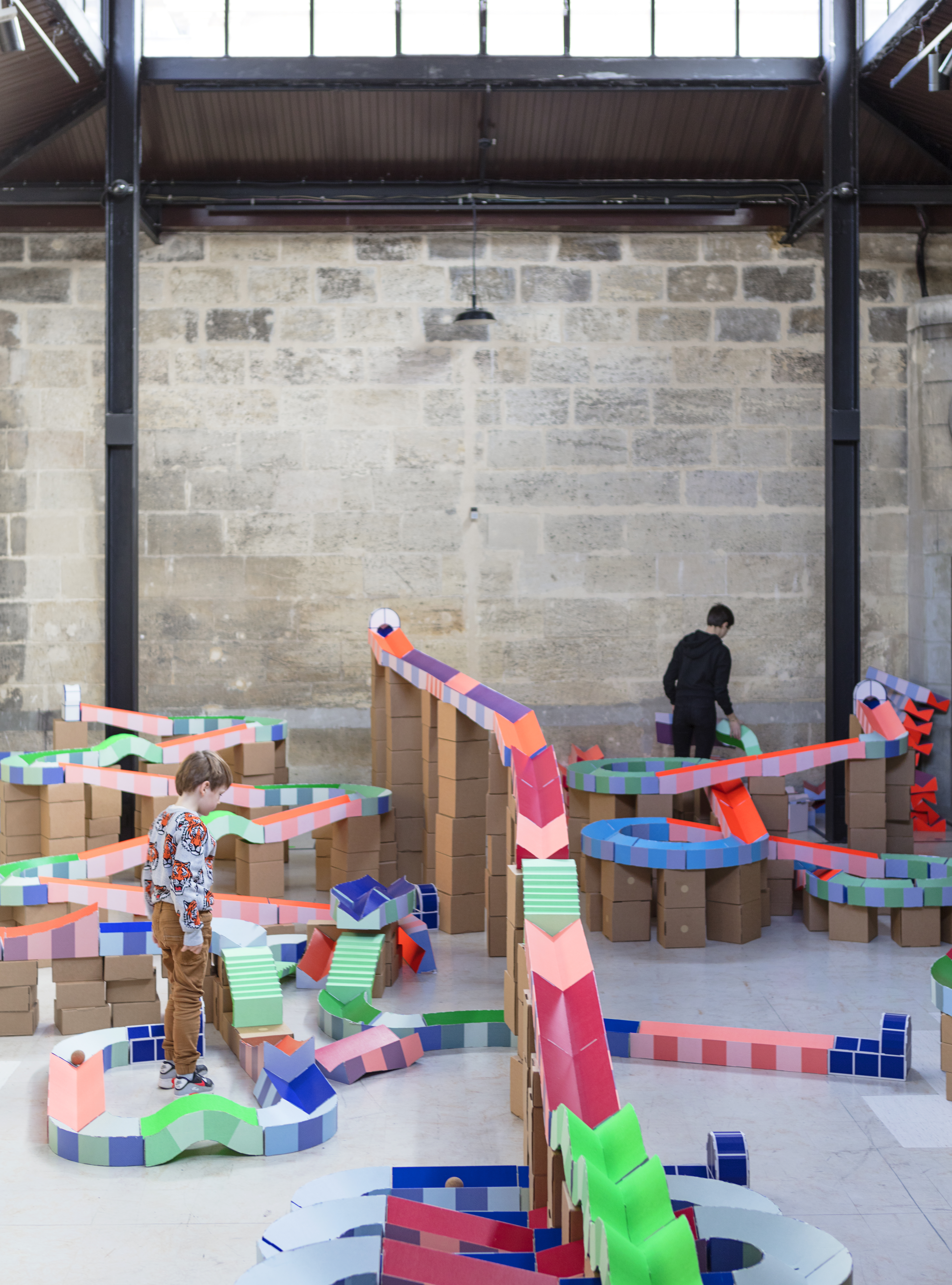 Entre art visuel et graphisme, le duo Pinaffo & Pluvinage propose des dispositifs à la fois surprenants et accessibles pour donner à voir, à sentir et à manipuler les mystères qui nous entourent. Avec leur installation Code Set, les deux artistes invitent les familles à jouer avec le codage. Et la couleur devint code qui devint suite de modules en carton, qui devint circuit à construire pour faire dévaler une balle…