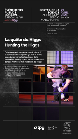 Cet événement unique, amusant, interactif et comique invite le public (jeunes et moins jeunes) à suivre toutes les étapes de la méthode scientifique pour tenter de découvrir par eux-mêmes le fameux boson de Higgs.