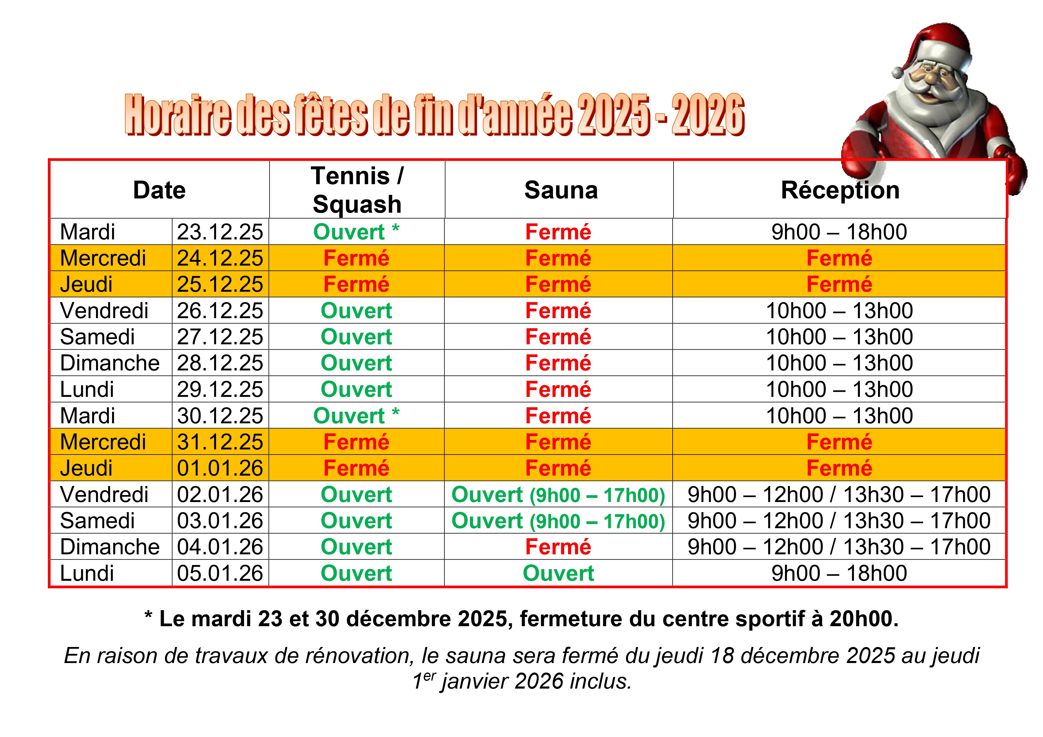 En raison de travaux de rénovation, le sauna sera exceptionnellement fermé du jeudi 18 décembre 2025 au jeudi 1er janvier 2026 inclus.